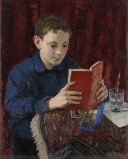 Натюрморт с фруктами, раскрытой книгой и горшком с цветами